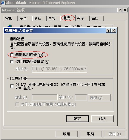 另外,如果IE的“局域網(wǎng)(LAN)配置”是“自動(dòng)檢測設(shè)置”,有時(shí)也會(huì)導(dǎo)致打不開localhost,建議把“自動(dòng)檢測配置”關(guān)閉掉,如下圖所示: