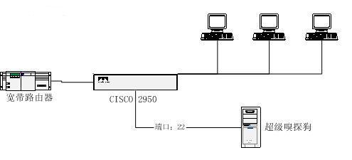 用超級(jí)嗅探狗局域網(wǎng)監(jiān)控軟件實(shí)現(xiàn)網(wǎng)絡(luò)監(jiān)控,需要把安裝超級(jí)嗅探狗的電腦接到交換機(jī)的“鏡像端口”上面。本例將以Cisco2950交換機(jī)為例,介紹如何通過(guò)Cisco2950交換機(jī)來(lái)實(shí)現(xiàn)局域網(wǎng)網(wǎng)絡(luò)監(jiān)控管理。此例也適用于Cisco的其他交換機(jī),如Cisco 2960, Cisco 3750等。