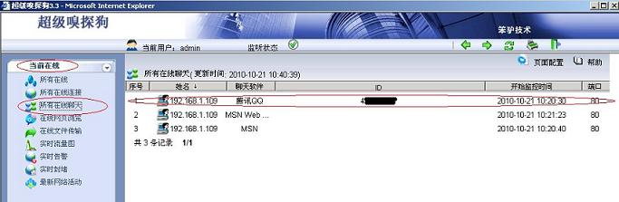 3. 接下來可以打開超級嗅探狗“當(dāng)前在線- - >所有在線聊天”如果禁止生效;QQ會自動轉(zhuǎn)換成TCP 80或者443端口進行通訊;如果QQ使用8000端口進行通訊,說明UDP端口沒有禁止成功。QQ通訊協(xié)議可以參考:QQ通訊協(xié)議介紹。