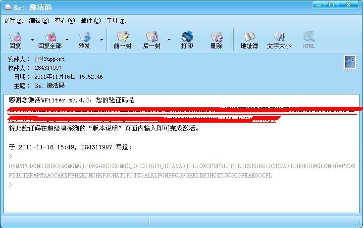 如果您選擇通過郵件的方式來激活您的產(chǎn)品,在對話框中輸入您購買時獲得的注冊碼,選擇郵件激活,點(diǎn)擊確定,頁面將返回一串激活碼,將激活碼的內(nèi)容通過郵件的方式發(fā)送到指定的郵箱中,公司將在兩個工作日內(nèi)將驗(yàn)證碼發(fā)給您,把收到的驗(yàn)證碼輸入到系統(tǒng),即可完成激活。