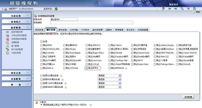 因?yàn)閯偛判略龅膮f(xié)議中添加的信息為“聊天軟件”的“軟件A”,因此在“新增封堵策略級(jí)別”中的“聊天軟件”找到“禁止軟件A”并勾選,填寫(xiě)級(jí)別名稱(chēng)并保存配置。5.對(duì)相應(yīng)電腦配置本封堵策略