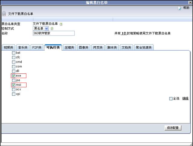 2. 在黑白名單對話框中選擇控制方式為“黑名單”,在可執(zhí)行類選擇exe、msi,在壓縮類選擇jar、rar、tar、zip。最后單擊“保存配置”