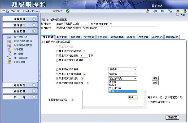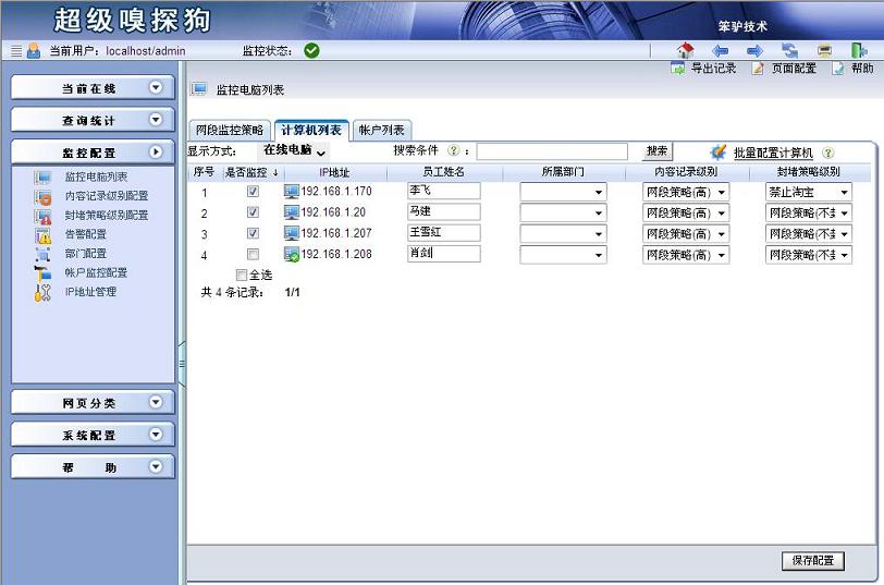 步驟四:選擇監(jiān)控配置->監(jiān)控電腦列表,進(jìn)入“監(jiān)控電腦列表”界面,點(diǎn)擊“計(jì)算機(jī)列表”選項(xiàng)卡,為計(jì)算機(jī)設(shè)置封堵策略級(jí)別。具體如下圖所示: