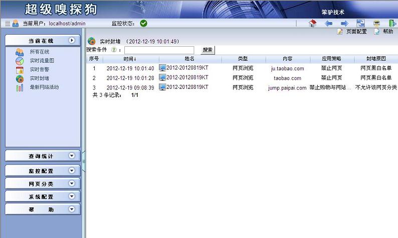 步驟六:選擇當(dāng)前在線->實(shí)時(shí)封堵,進(jìn)入“實(shí)時(shí)封堵”界面,可以看到已經(jīng)被禁止訪問(wèn)的網(wǎng)站的記錄。具體如下圖所示: