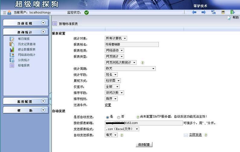 步驟5:點(diǎn)擊查詢統(tǒng)計(jì)->標(biāo)準(zhǔn)報(bào)表,在“標(biāo)準(zhǔn)報(bào)表”界面中點(diǎn)擊“新增標(biāo)準(zhǔn)報(bào)表”,進(jìn)入“新增標(biāo)準(zhǔn)報(bào)表”界面,配置好報(bào)表基本信息后,可選擇配置接收?qǐng)?bào)表的部門經(jīng)理的郵箱。具體配置如下圖所示: