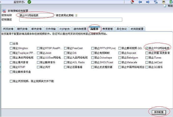 1.先新建一個封堵策略,名為“禁止PPS”,選擇“流媒體”,勾選“禁止PPS網(wǎng)絡(luò)電視”,保存設(shè)置。