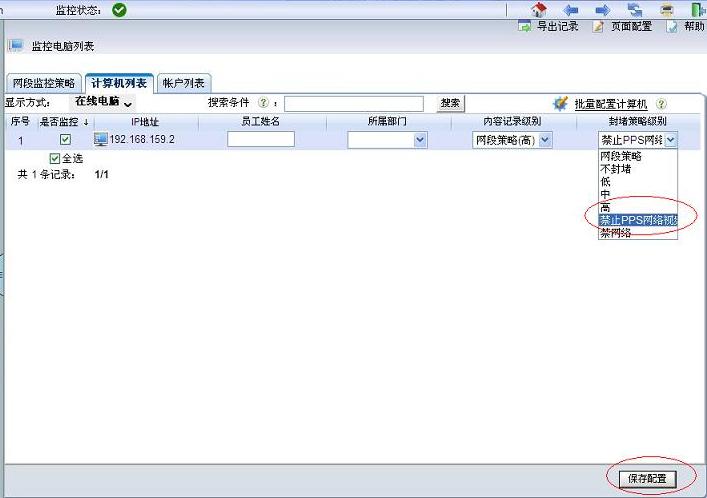 2.在“監(jiān)控電腦列表”中配置你想禁止的移動設(shè)備的IP策略為“禁止PPS”,保存設(shè)置,應(yīng)用新配置。