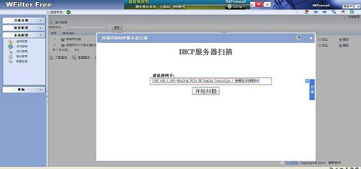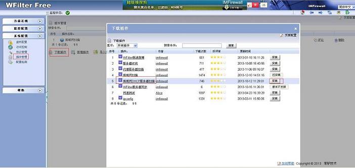 打開wfilter free,進(jìn)入到“系統(tǒng)配置”——“插件管理”,點(diǎn)擊下載插件,彈出“下載插件”框,安裝“局域網(wǎng)DHCP服務(wù)器掃描”插件。