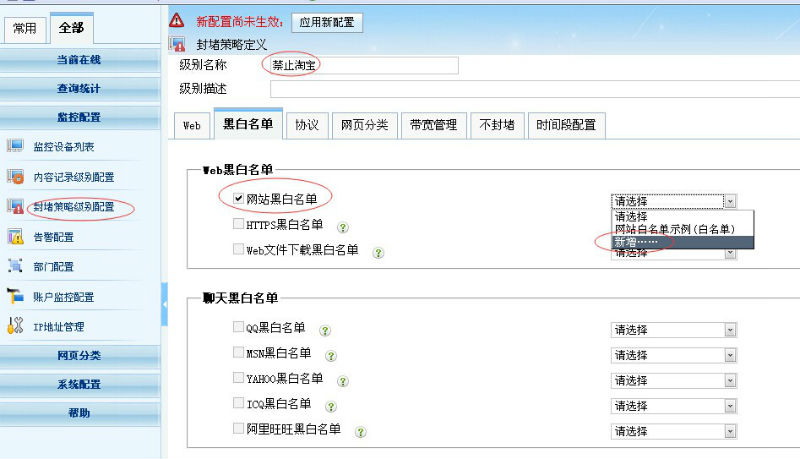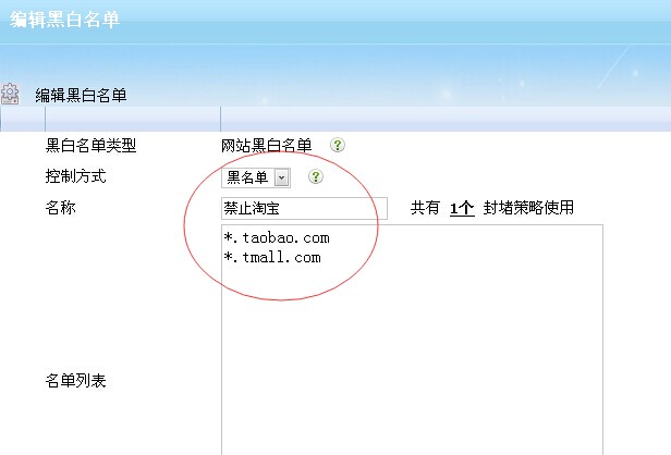 2.編輯黑白名單,控制方式為黑名單,名單列表中輸入 *.taobao.com和 *.tmall.com,如下圖所示: