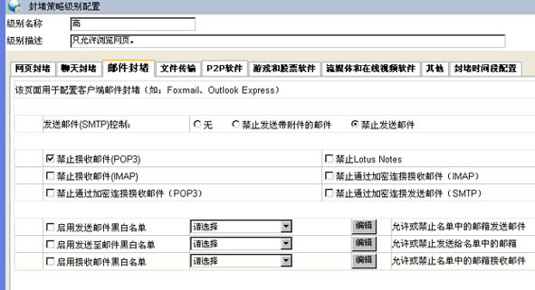 對(duì)于客戶端郵件,可以選擇"郵件封堵"標(biāo)簽,具體可以配置禁止收發(fā)以及黑白名單過濾(參考網(wǎng)站黑白名單配置用例)等.如圖: