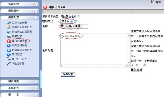 2.1 在“監(jiān)控配置 -> 黑白名單配置”新增一個(gè)網(wǎng)站黑白名單,控制方式為黑名單,名稱為禁止8點(diǎn)報(bào)閱讀器,如下圖所示:
