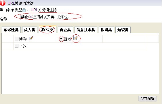 5.在新增級別,網頁封堵選項卡中,勾選URL關鍵詞過濾,選擇禁止QQ空間好友買賣、搶車位、游戲基地,如下圖所示: