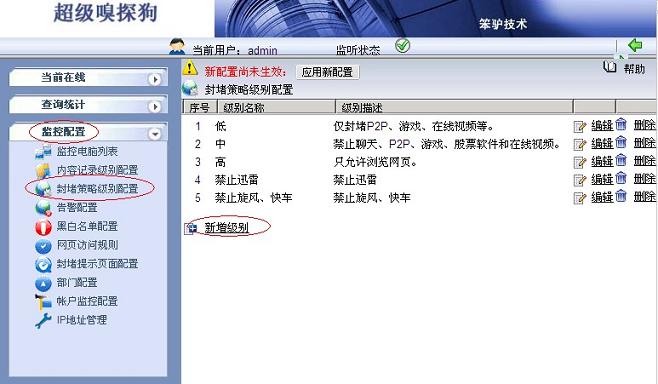 4.在“監(jiān)控配置-- >封堵策略級別配置中”新增級別,如下圖所示: