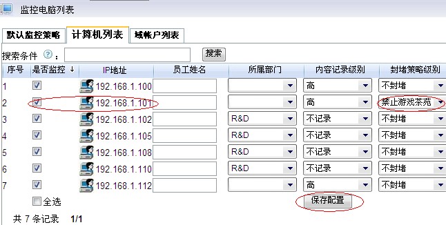 1.4 在“監(jiān)控配置->監(jiān)控電腦列表”里,選中要封堵的主機(jī)和封堵策略級(jí)別,保存配置并應(yīng)用封堵策略,如下圖所示: