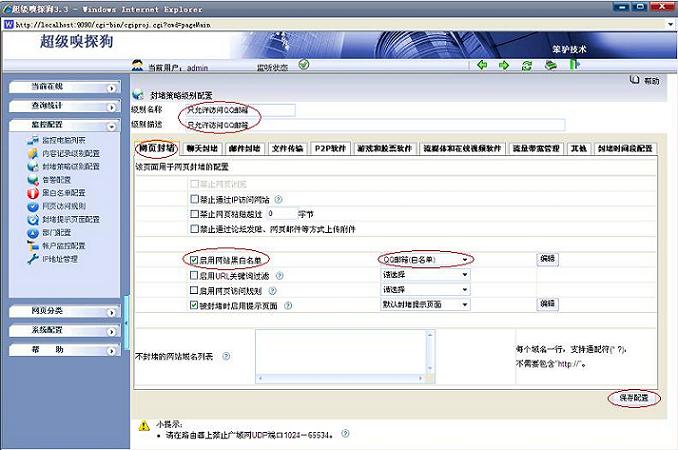 最近有用戶詢問怎樣通過超級(jí)嗅探狗設(shè)置,只讓局域網(wǎng)用戶訪問QQ郵箱,下面本文將介紹利用超級(jí)嗅探狗的白名單功能禁止用戶訪問除QQ郵箱以外的網(wǎng)站。想了解如何禁止QQ農(nóng)場(chǎng),QQ游戲,P2P軟件下載可以訪問我們的博客。