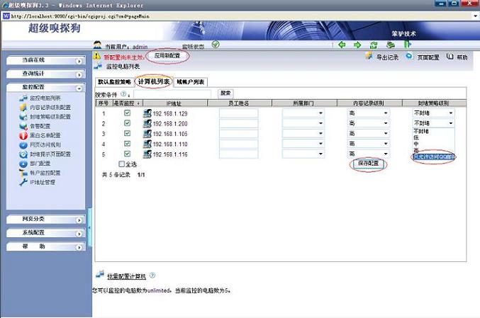 3.在“監(jiān)控配置-- >監(jiān)控電腦列表”中應(yīng)用封堵策略,如下圖所示: