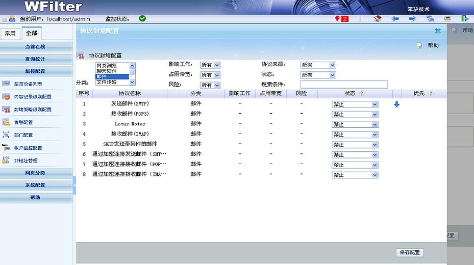 WFilter(超級(jí)嗅探狗)可以監(jiān)控、封堵局域網(wǎng)內(nèi)電腦的收發(fā)郵件行為,可以禁止附件,限制能使用的郵箱等;從而保障企業(yè)信息安全。