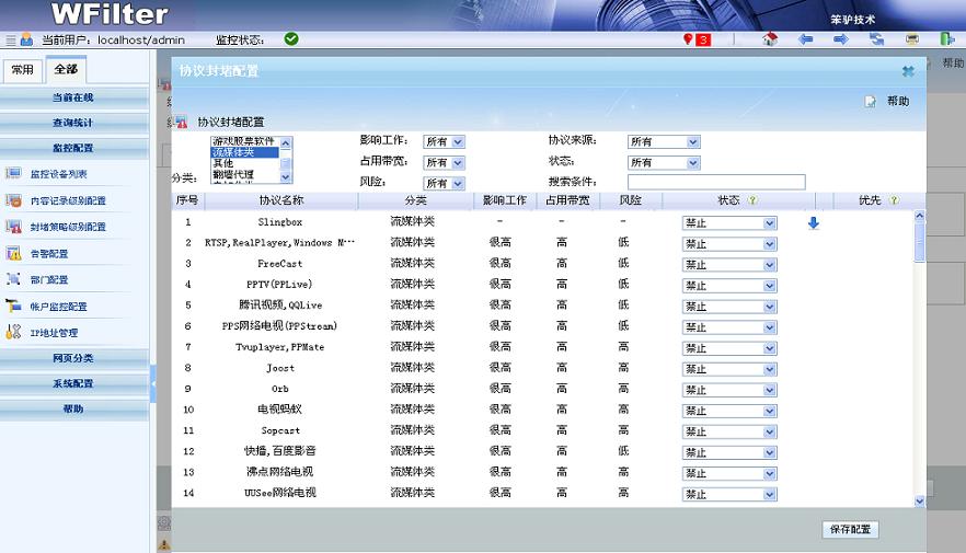 - 支持管理網(wǎng)頁(yè)、聊天、郵件、流媒體、游戲股票、P2P下載等多類上網(wǎng)行為,支持500多種協(xié)議和軟件。