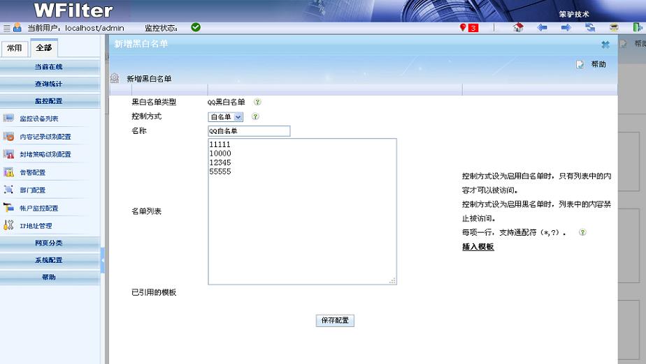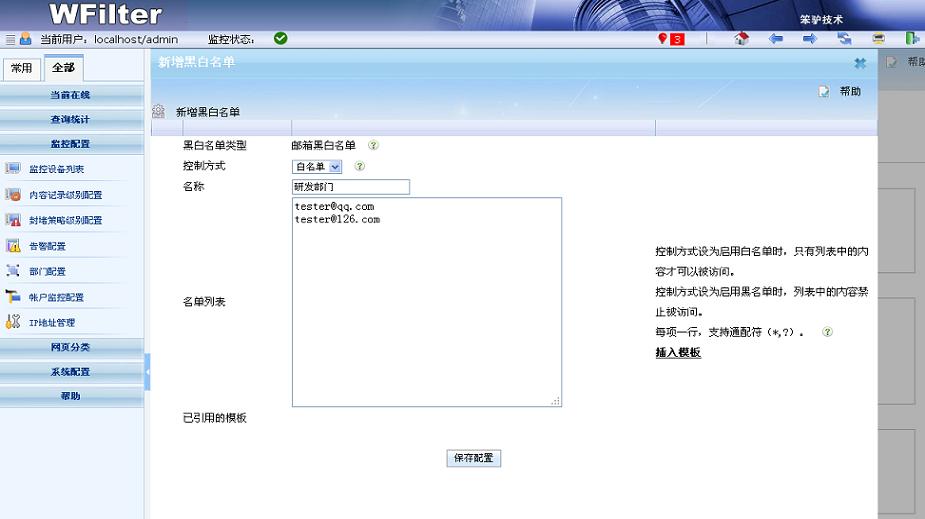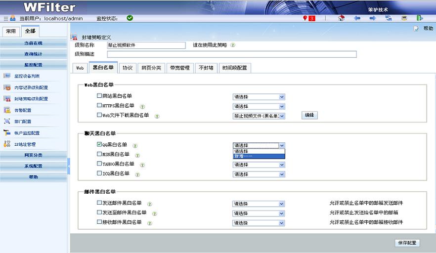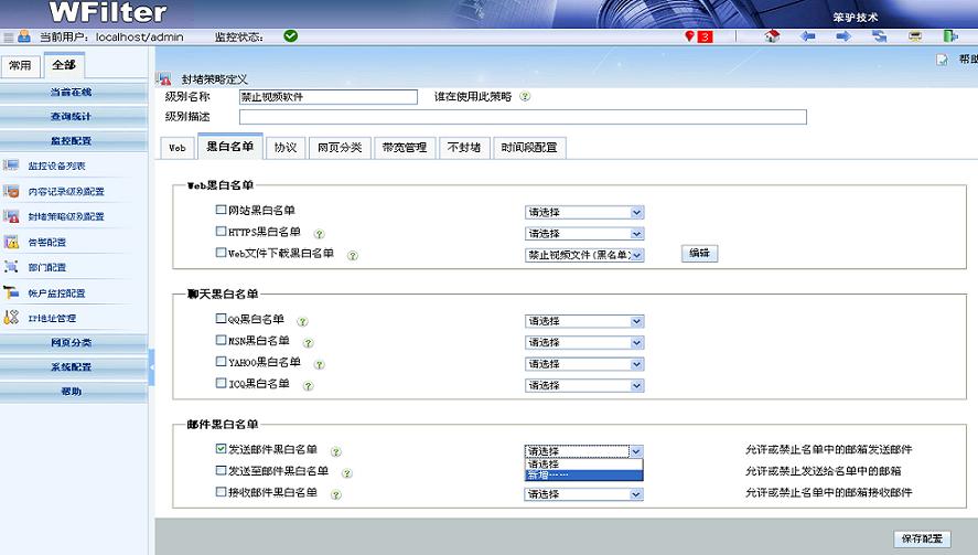 - 支持網(wǎng)頁(yè)黑白名單、聊天ID黑白名單、郵件黑白名單、下載黑白名單等多種黑白名單。