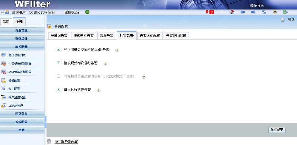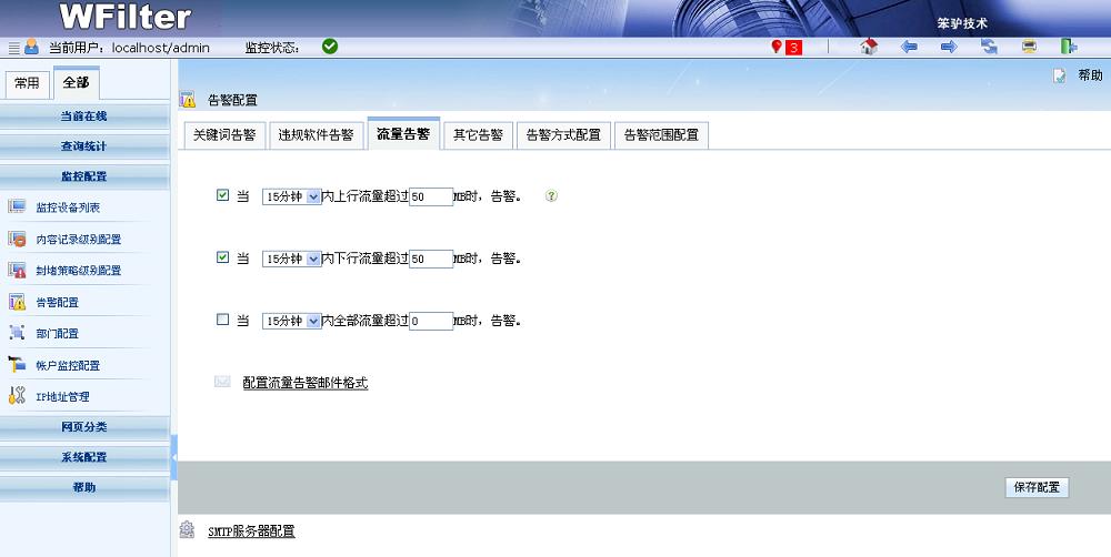 WFilter(超級嗅探狗)可以對關(guān)鍵詞、指定協(xié)議、流量大小等多種情況設(shè)置告警,告警信息以郵件或者syslog的方式發(fā)送給管理員。