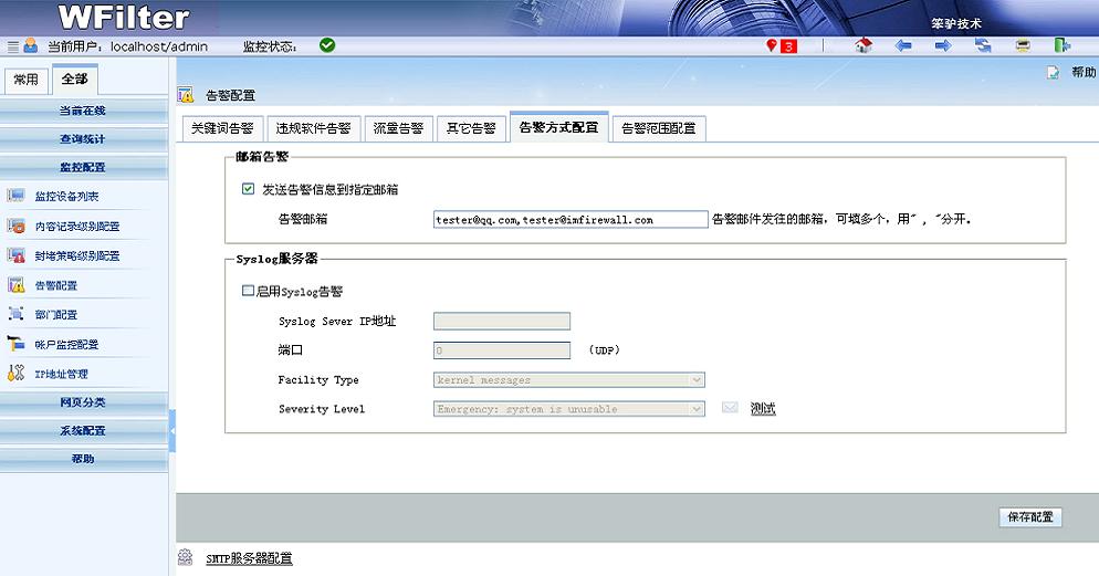 - 支持兩種告警方式:發(fā)送到管理員郵箱,發(fā)送到syslog服務(wù)器。