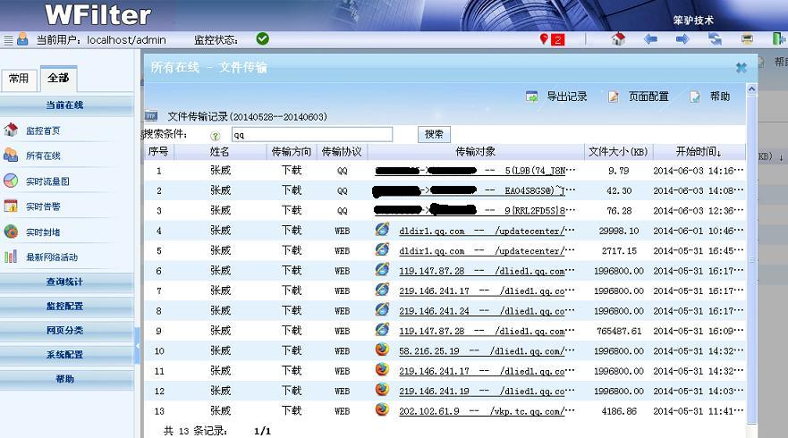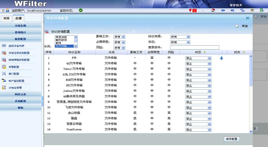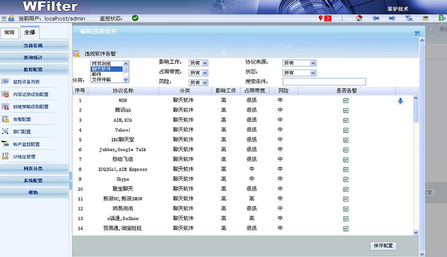 WFilter(超級(jí)嗅探狗)可以監(jiān)控管理局域網(wǎng)內(nèi)的聊天行為、屏蔽聊天賬號(hào)、或者屏蔽聊天軟件的文件傳輸。