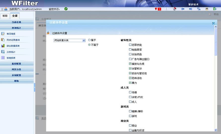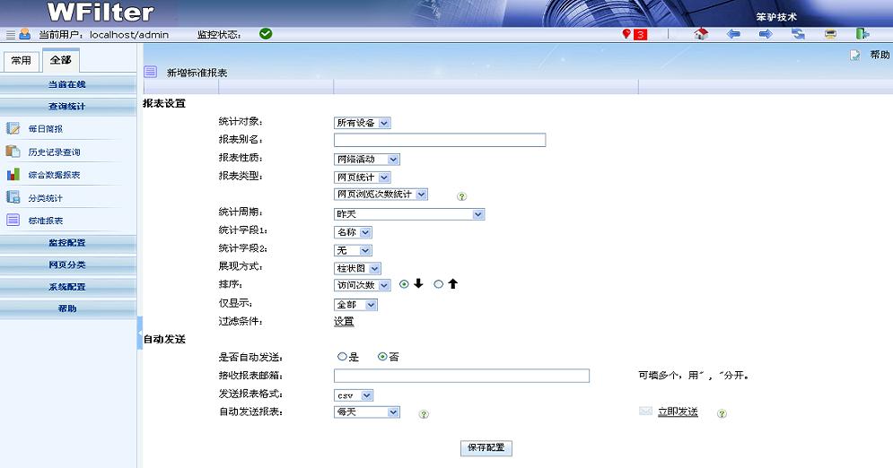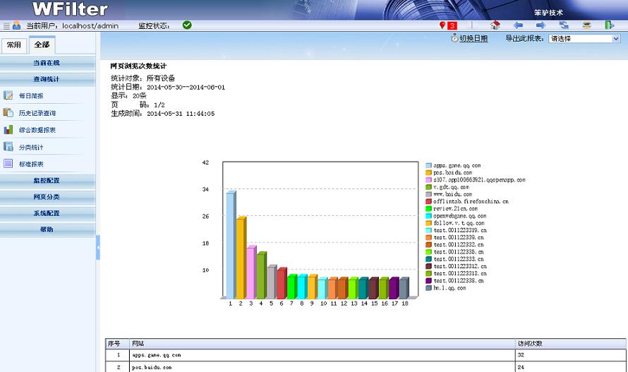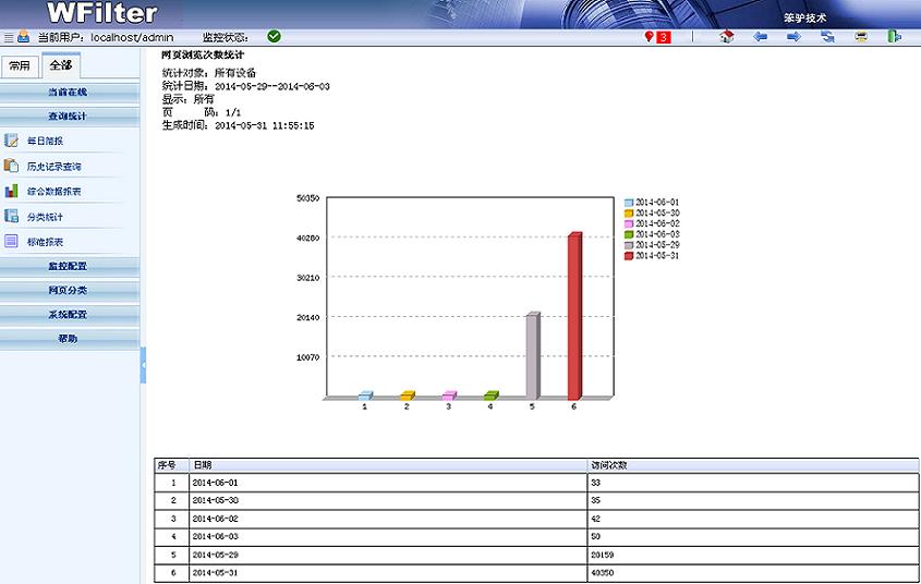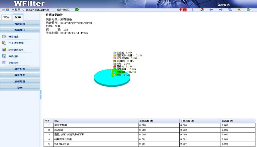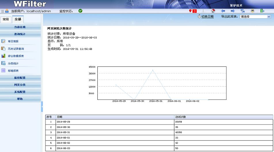 WFilter(超級(jí)嗅探狗)支持歷史記錄查詢,各種上網(wǎng)行為統(tǒng)計(jì)報(bào)表,支持?jǐn)?shù)據(jù)、圖形等多種報(bào)表形式。