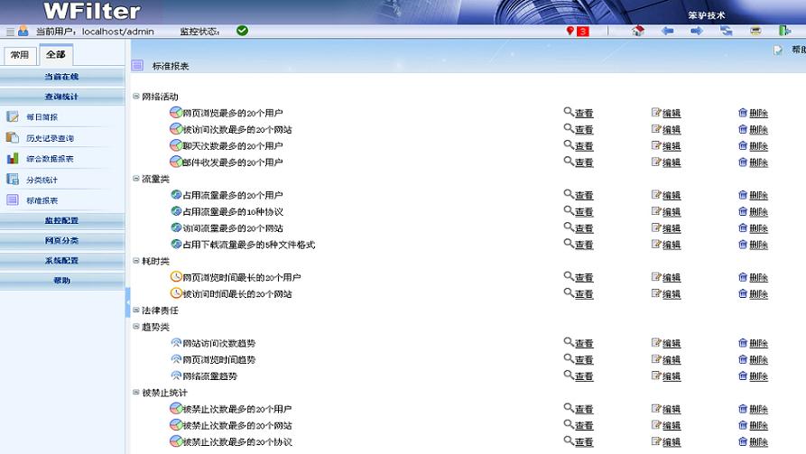 - 內(nèi)置了預(yù)先定義好的標(biāo)準(zhǔn)報(bào)表,包括:網(wǎng)絡(luò)活動(dòng)類,流量類,耗時(shí)類,法律責(zé)任,趨勢(shì)類。