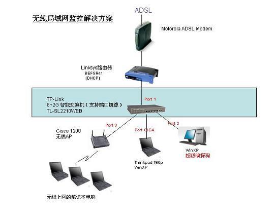 在本例中,為了能同時對有線環(huán)境的機(jī)器和無線環(huán)境的機(jī)器進(jìn)行監(jiān)控。我們增加了一個TPLINK的鏡像交換機(jī)(TL-SL2210WEB)。并且需要對無線AP進(jìn)行設(shè)置。